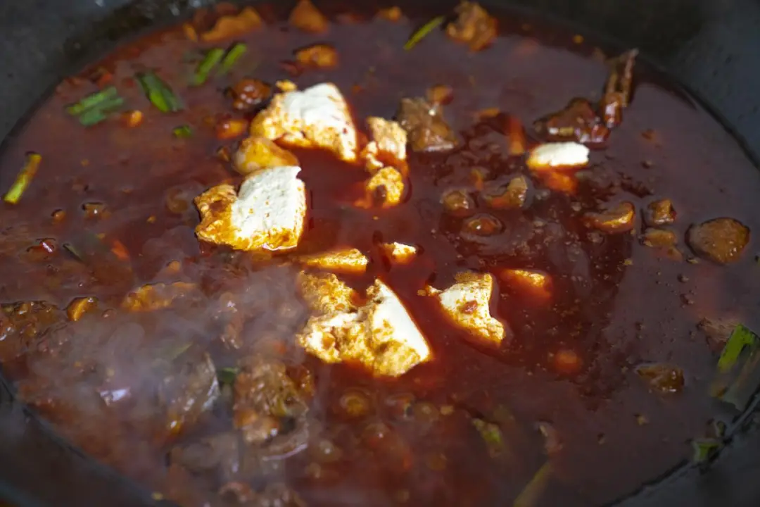燕楼鸡哈豆腐追求的是麻、辣、鲜、香的完美平衡。入口先是糍粑辣椒的香辣和鸡肉的鲜香,辣椒辣而不燥,随后是豆腐本身的豆香和鲜甜,最后是青蒜的清香回味。与其他辣味菜肴不同,鸡哈豆腐的辣是温和的、有层次的,并不掩盖豆腐的本味。碎豆腐创造了更大的表面积,在铁锅中煨煮的时候在毛细作用下使味道渗透其中,每一口都滋味十足。