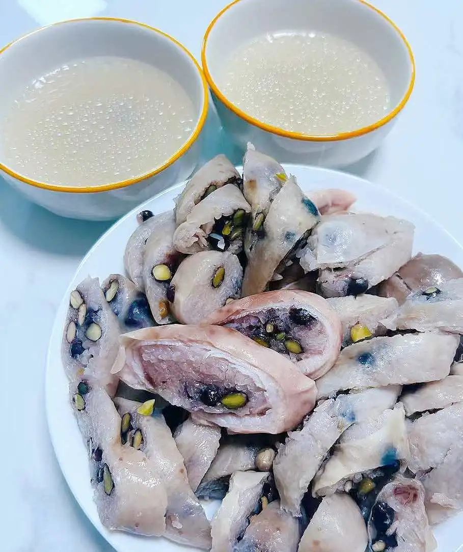 出锅后的糯米挣猪肠头,猪肠头的柔韧裹着糯米的软糯,糯米的晶莹、黑豆的乌亮、花生的金黄便跃然眼前。一口下去,层次分明的口感在齿间交融——肠衣的柔韧、糯米的粘糯、黑豆的粉糯,汇聚成一股温暖而踏实的力量。