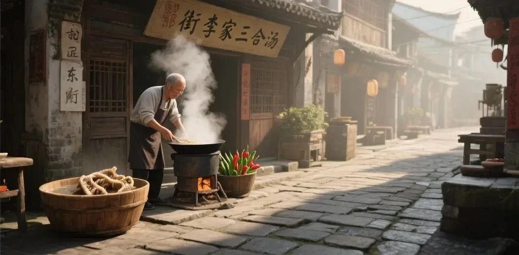老李的店里挂着块旧木牌,写着 “霸王汤” 三个字。他说这名字是曾国藩给的:当年湘军在新化练兵,士兵们常喝这汤驱风湿、补体力,曾国藩尝了赞不绝口,说 “此汤有霸王之气”,从此这名号就传了下来。更早的时候,梅山先民还把三合汤当 “犒军菜”,传说蚩尤带兵打仗时,就用牛血、牛肉煮汤给士兵们暖身,辣汤下肚,将士们战斗力都强了几分。