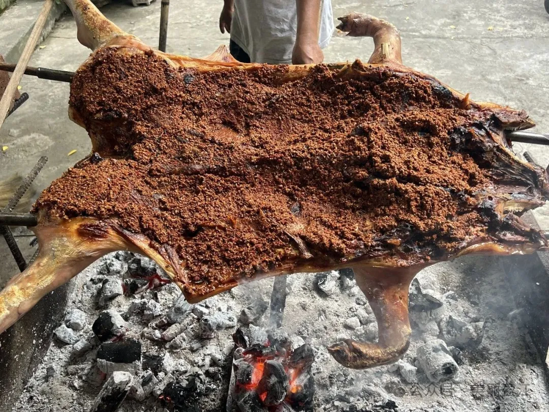 其精髓,始于对食材的严苛甄选。烤制选用的是德宏本地特有的小耳朵猪,这种猪体形小巧、皮薄肉嫩、脂肪分布均匀,肉质自带清甜,为烤乳猪的上乘口感奠定了坚实基础。制作工艺更是考究至极,乳猪经傣家传统手法细致处理,既要保证外形完整,又要剔除多余杂质;随后以竹签固定骨架、铁丝巧妙塑形,让整只乳猪舒展地架于炭火之上。烤制过程严守“大火烧皮、小火烘肉”的古老法则,先以文火慢烘,锁住肉质内部的鲜美汁水;再转猛火炙烤,让猪皮逐渐变得金黄酥脆。烤制期间,匠人需手持烤架匀速转动,不时调整火候与角度,历经数小时耐心守候,方能成就皮色金红、酥香扑鼻的绝佳品相。