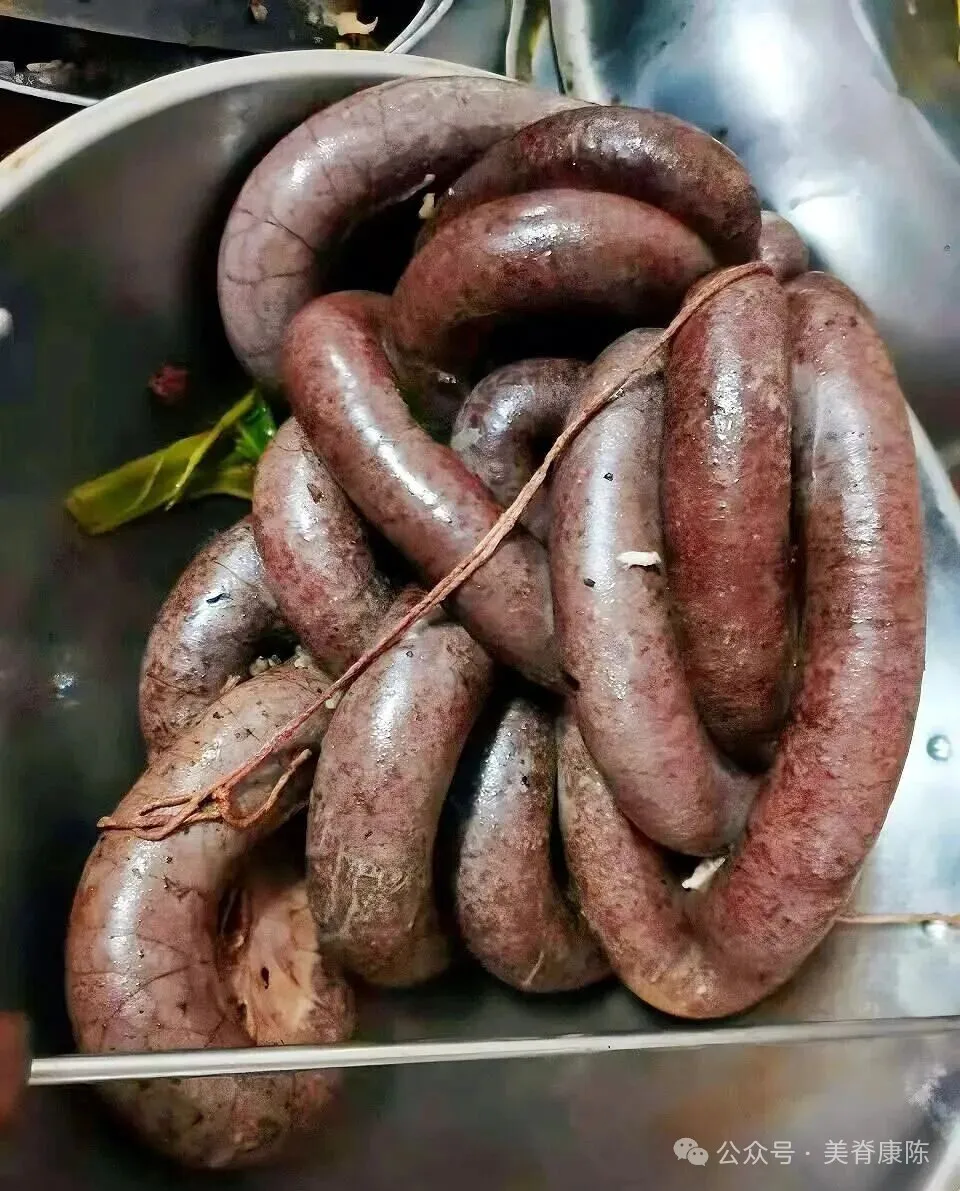 说白了就是血肠 , 但河池这边的做法很特别。 不是单纯灌猪血 , 里面还加了玉米粉、糯米、炒花生 , 再撒点五香粉调味。 听说是逢年过节家家户户都做的 , 街边小巷随处能买到。