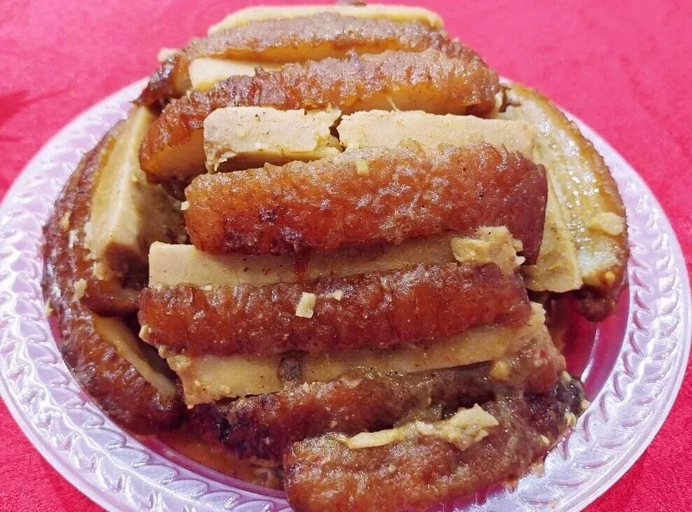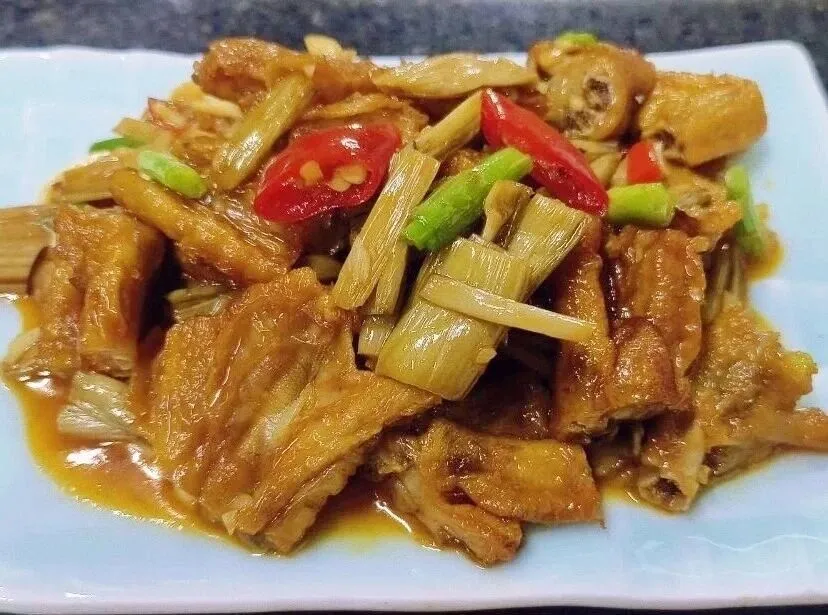 酸香解腻,回味悠长。芋檬酸以芋头梗腌制而成,是市级非物质文化遗产美食。鸭脚经油炸至金黄,与姜蒜、香料及芋檬一同焖煮,吸饱酸香汤汁的鸭脚软糯入味,芋檬则以清新酸香化解油腻,滋味相得益彰,回味悠长。