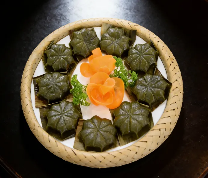 清香微涩,柔韧甘醇。以野生艾叶煮烂制泥,与糯米粉、粘米粉揉团,包入花生芝麻糖馅蒸熟。翠绿清香,甜中带涩,风味独特。