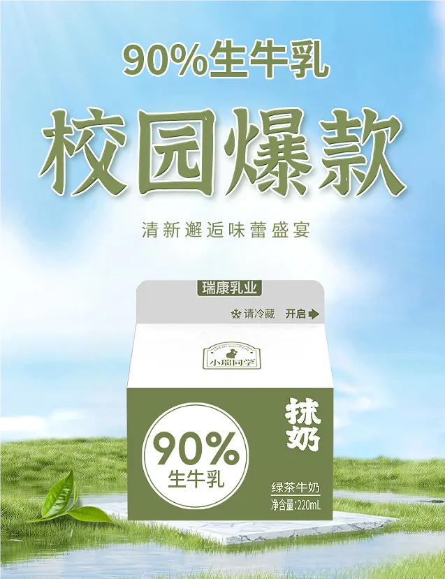 产品简介:瑞康乳业旗下校园爆款产品“小瑞同学抹奶”焕新升级,奶源来自瑞康自有生态牧场,生牛乳配比提升至≥90%,产品中的天然营养成分比例更高,蛋白质含量显著增加;严选优质产区抹茶粉,色泽翠绿、香气浓郁、滋味鲜爽、余味悠长。
