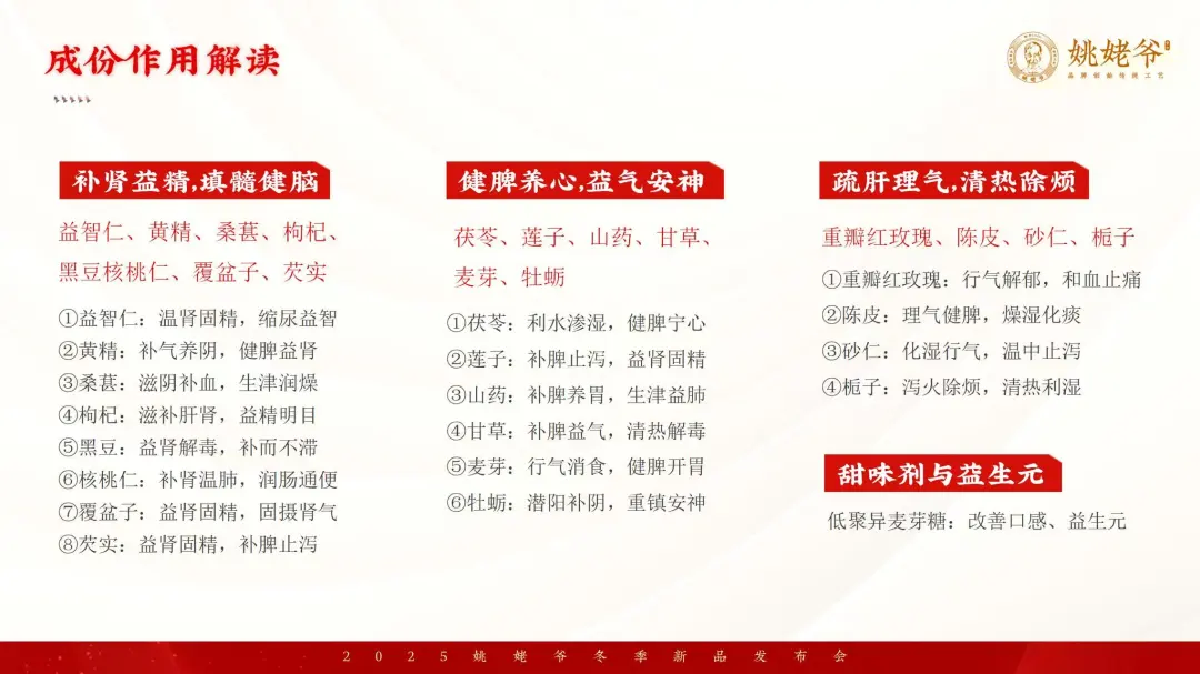 所以呢,在我们的这款益智仁牡蛎本草饮里面,加入了肾益精、填髓健脑的益智仁黄精、桑葚、枸杞、黑豆、核桃仁