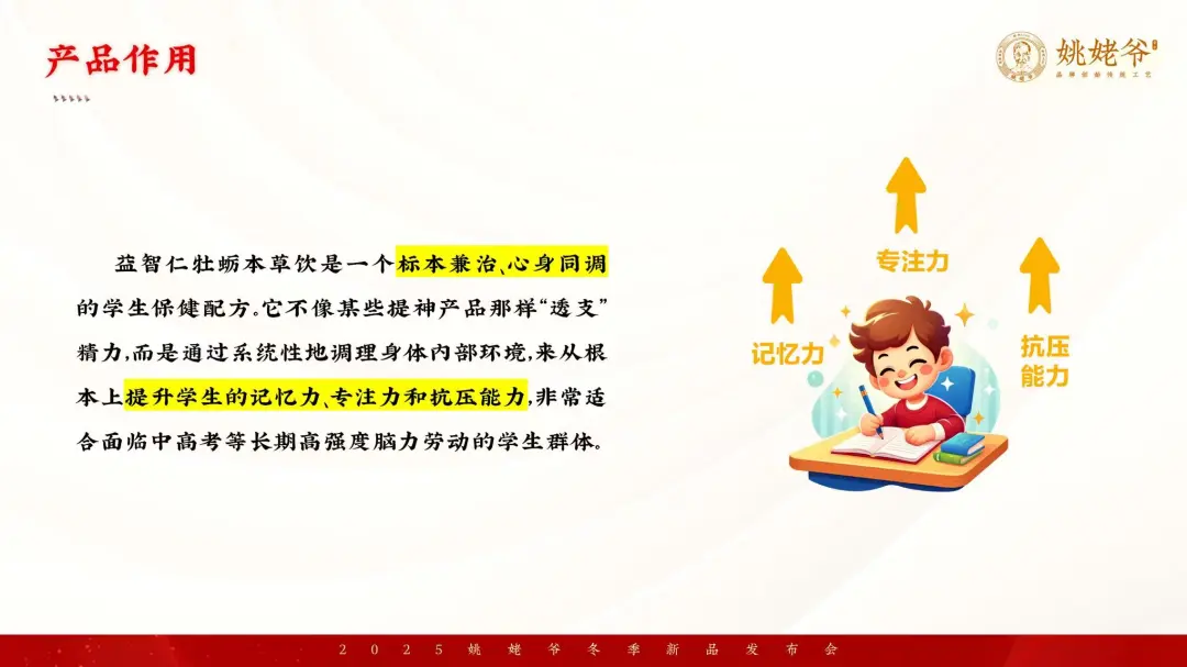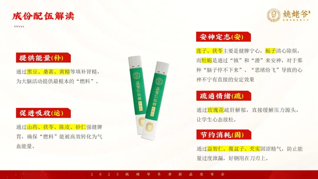 所以我们这款益智仁牡蛎本草饮,他从记忆力、远大的志向、专注力、抗压能力四个维度来形成组方