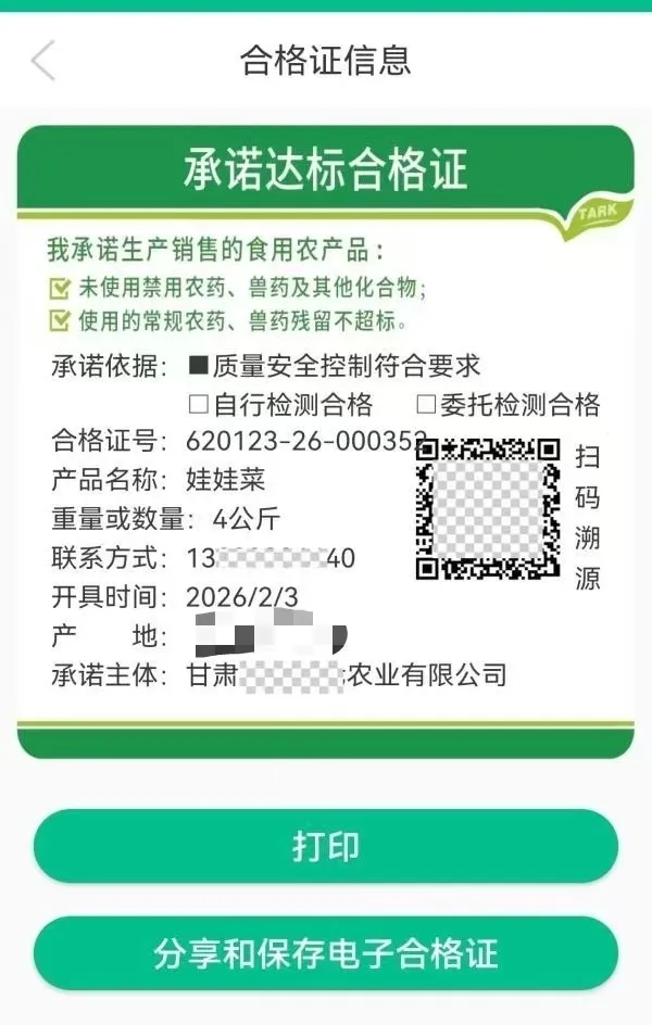 使用定制承诺达标合格证的生产经营主体点击“开具合格证”“扫码开具”模块,扫描定制承诺达标合格证上的二维码,依次填写产品品种、数量/重量、产地、承诺依据、目的地等相关信息,开具合格证。