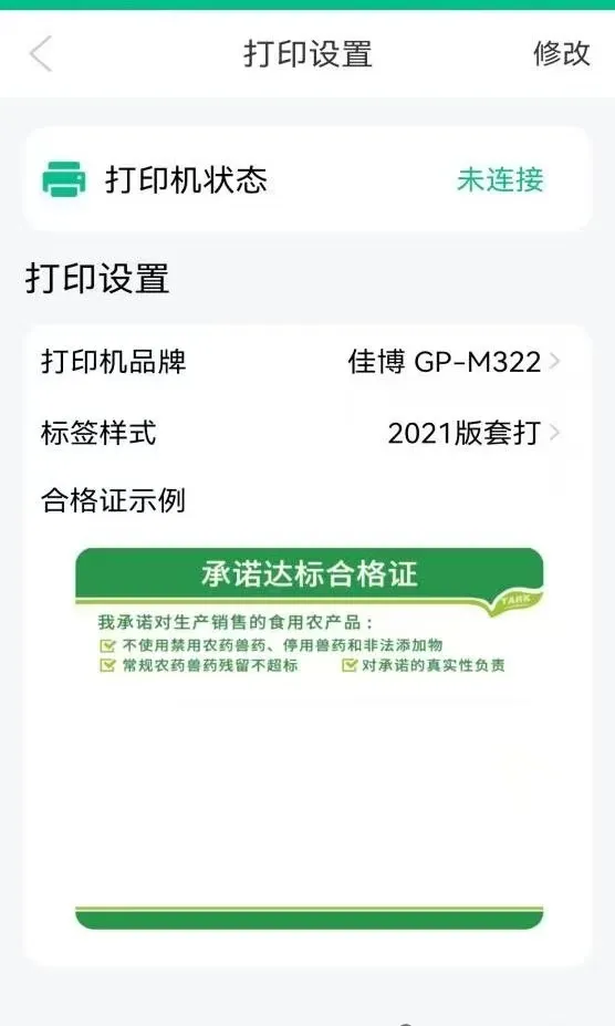 点击“更多功能”页面底端“打印设置”模块,可预先设置连接蓝牙打印机。目前支持佳博a优博讯、实达、精臣等品牌型号的蓝牙打印机,可由生产经营主体自行选配。