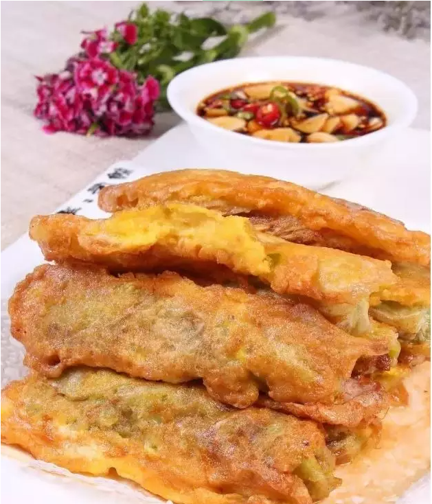 沾生粉拖蛋液后煎至金黄色。