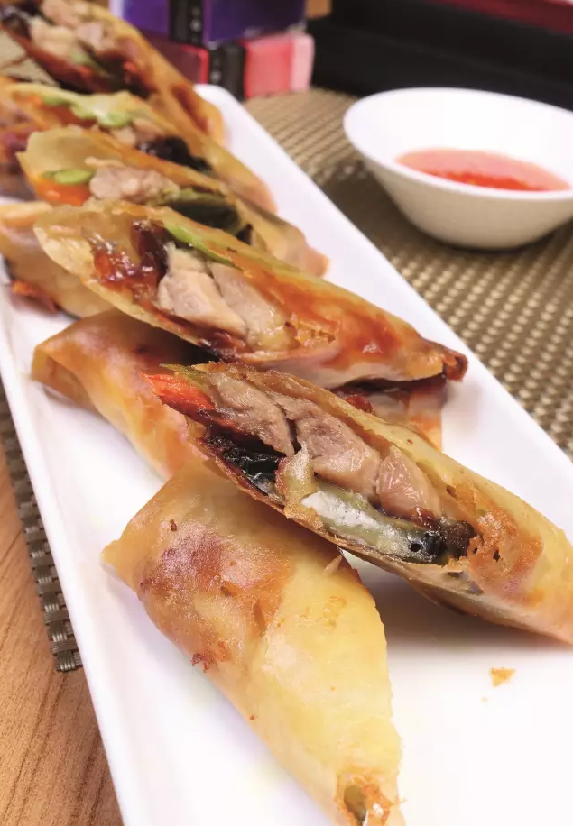 走菜流程:取5个春卷,放入电炸炉180℃炸3分钟,待其表面金黄、完全成熟,捞出沥油,将春卷从中间斜刀一切为二,摆入盘中,带泰式甜辣酱即可走菜。