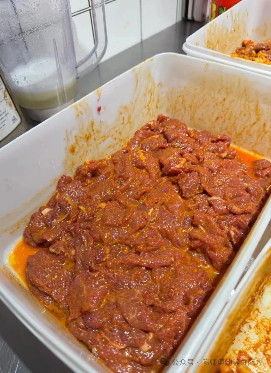 2. 将以上所有调料加入肉片中,抓拌均匀上劲,最后加入腌制红油搅拌均匀即可;