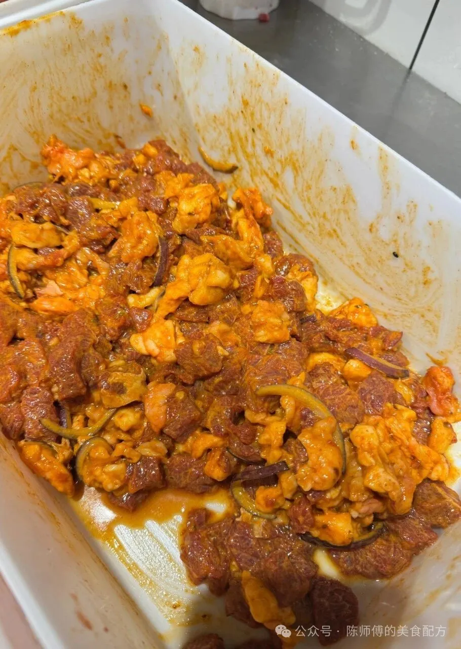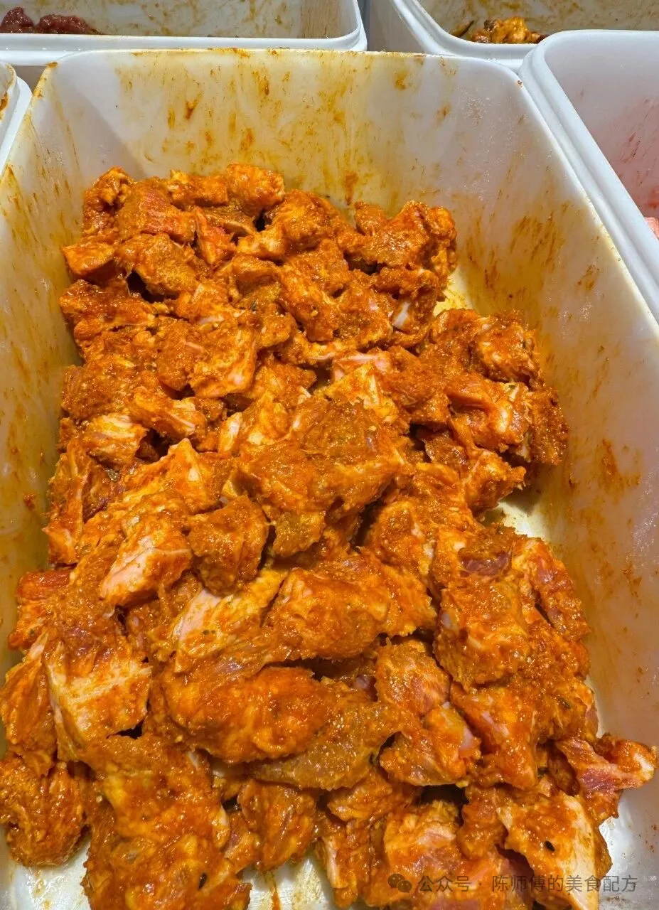 掌中宝1斤、松肉粉1克、嫩肉粉2克、味精2克、鸡精3克、盐1克、十三香1克、白胡椒粉1克、孜然2克、料酒8克、红油30克