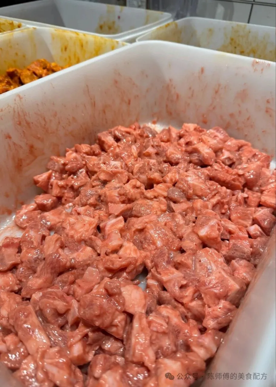 牛腿肉1斤、松肉粉3克、嫩肉粉2克、味精2克、鸡精3克、盐1克、十三香1克、白胡椒粉1克、耗油10克、料酒8克、老抽3克、红油30克
