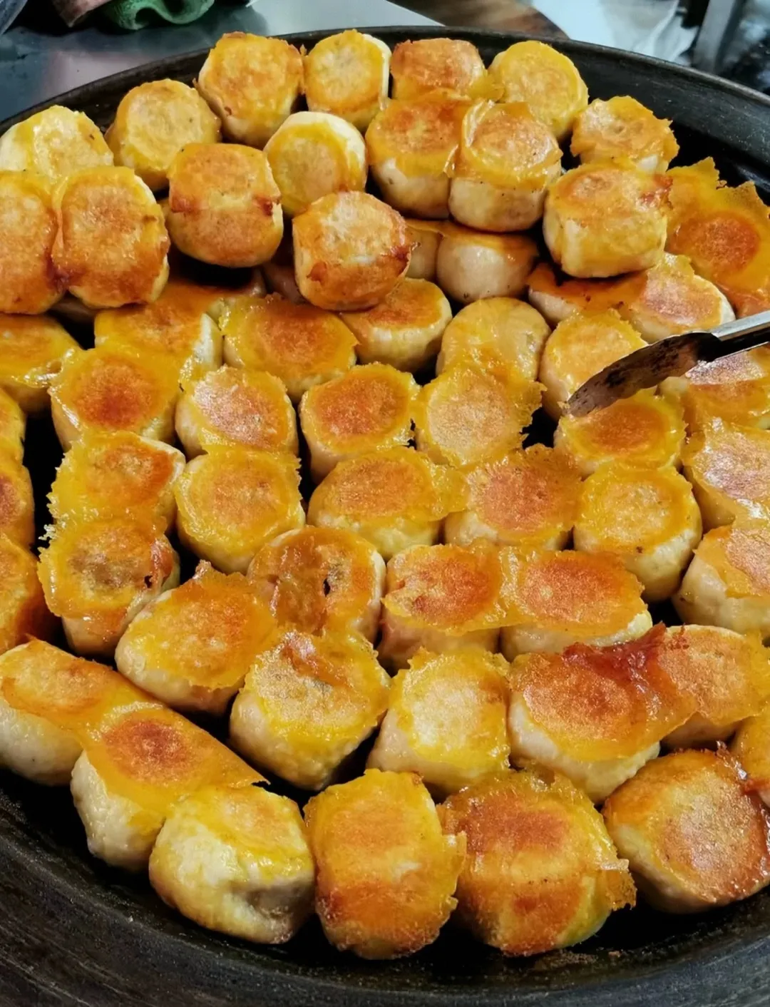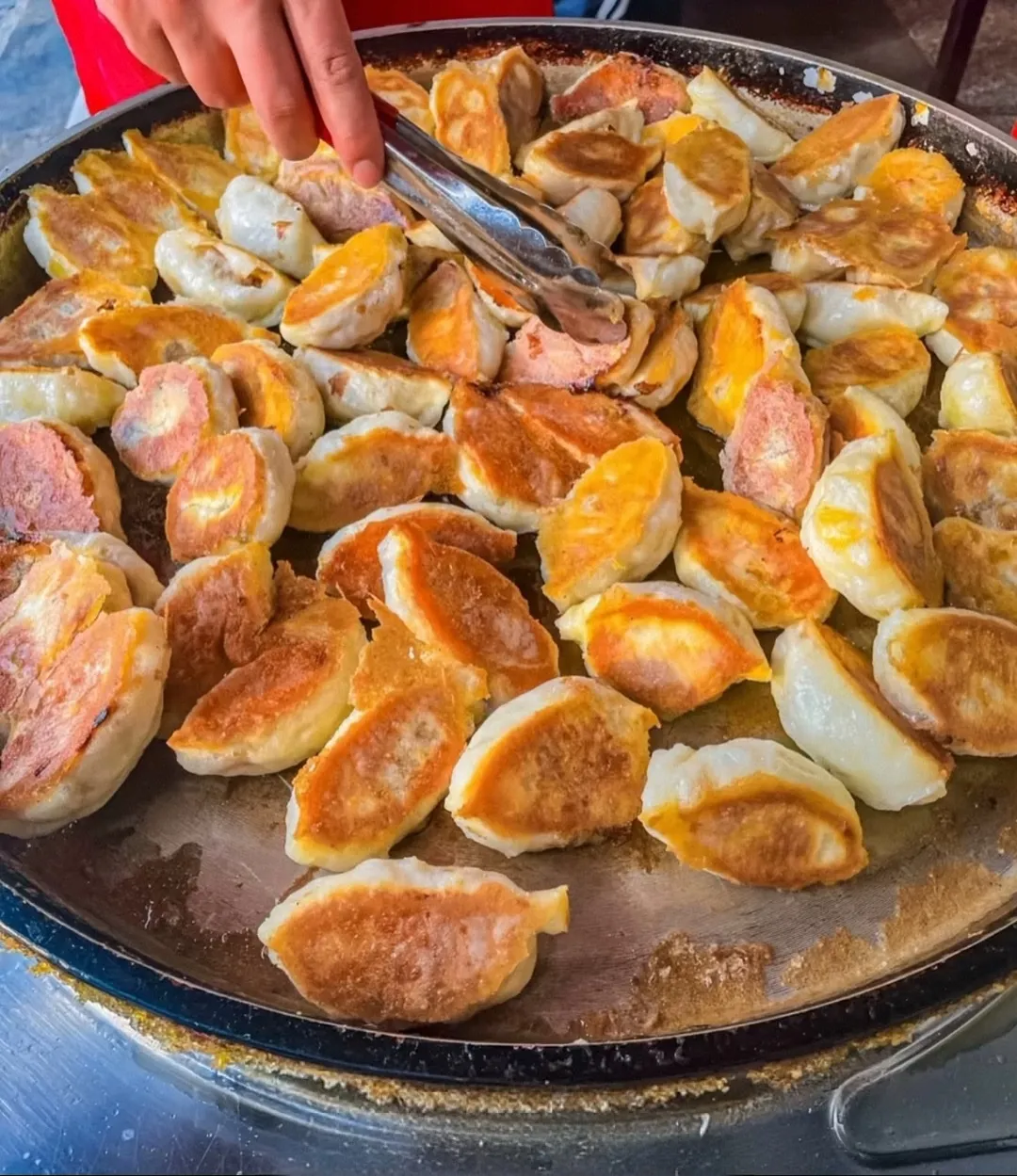 4.倒油完成后,盖锅盖再煎30秒,进行包子反面,全部反完,盖锅盖再煎 40秒至1分钟、即可出锅。(根据当地人的口感问题,可进行煎制时间改动。)