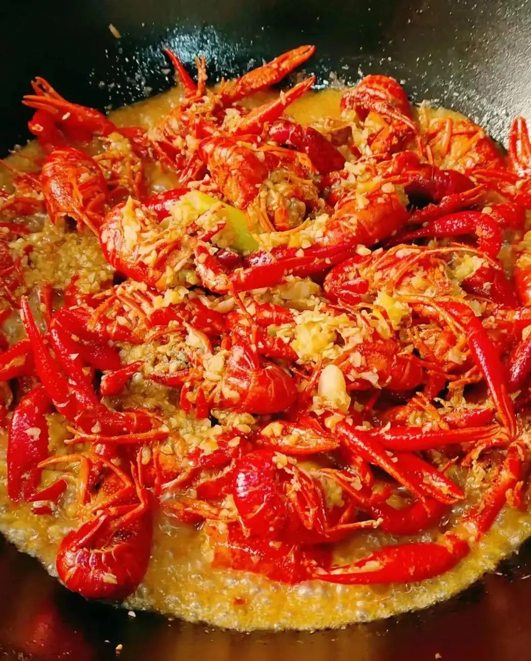 倒入腌制好的小龙虾(5 斤 / 锅,避免过多导致翻炒不均),大火快速翻炒 5 分钟,至虾壳全部变红、表面微焦; -