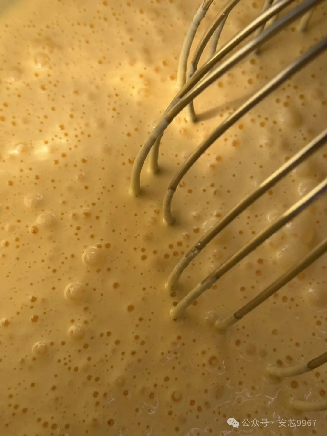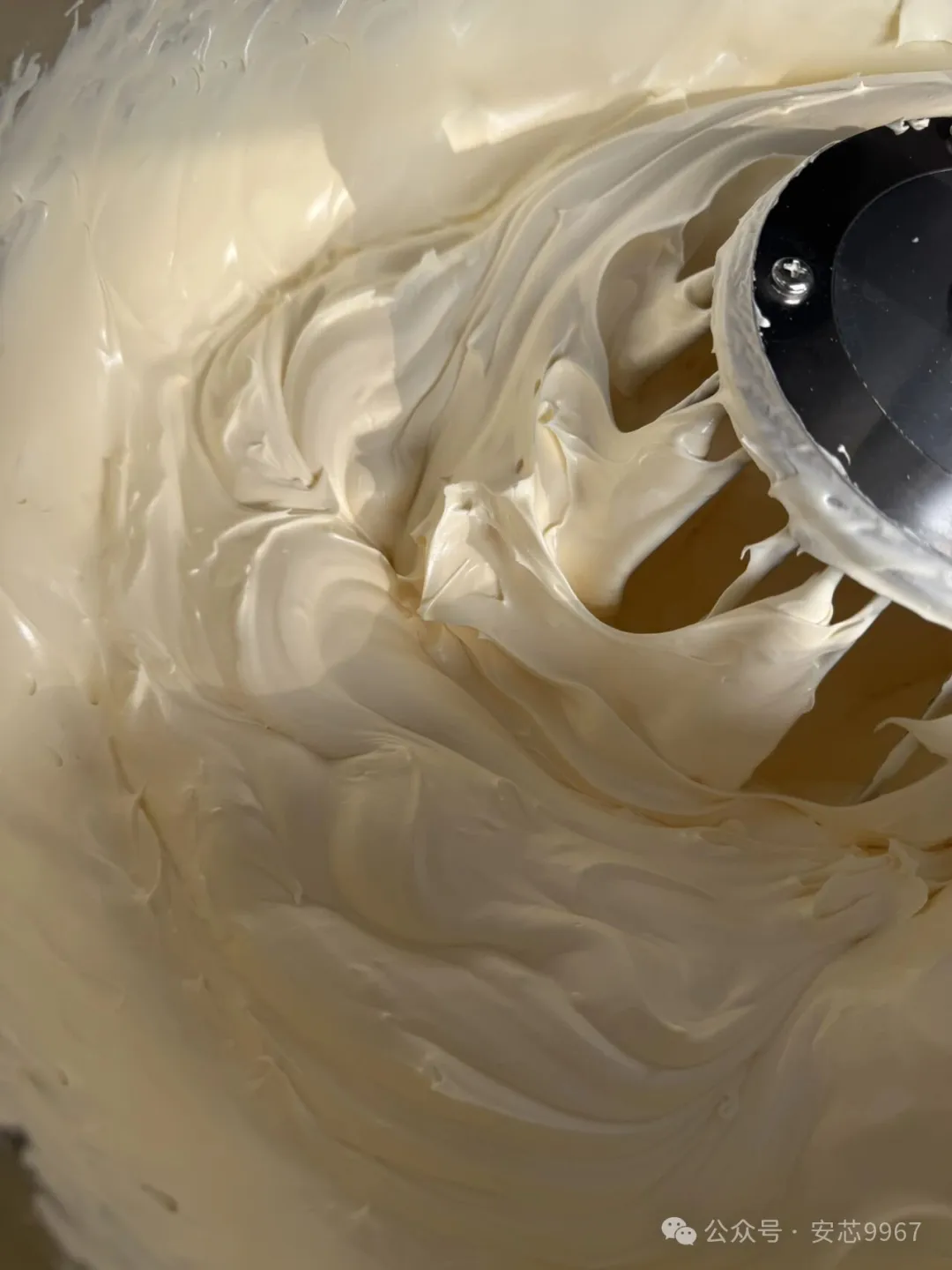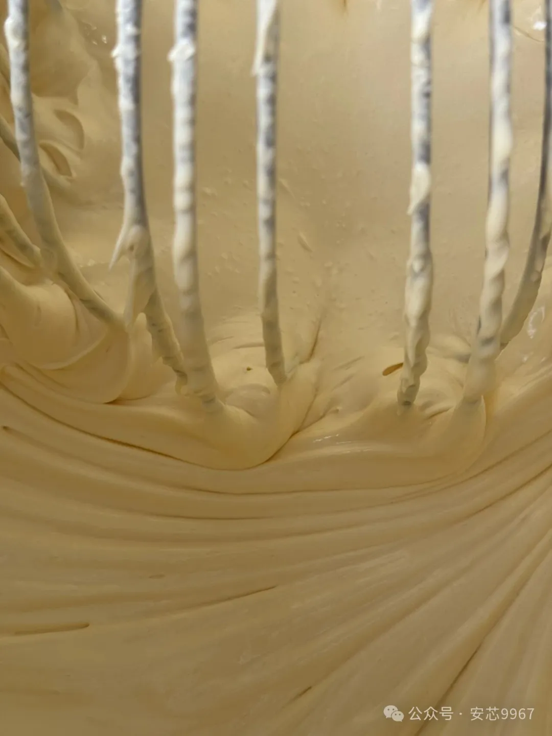加入蛋糕油,高速搅拌至面糊呈细腻、流动性减弱的状态(提起打蛋器,面糊呈丝带状缓慢落下)。