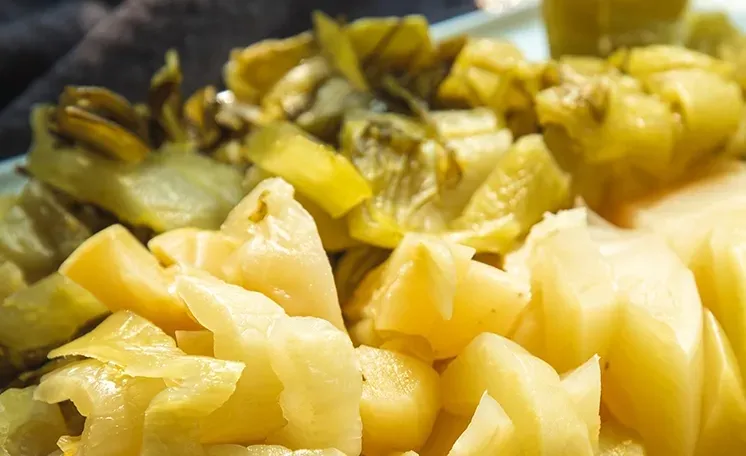 经过自然发酵,酸菜呈现出柔和的酸味,酸度适中,不会过于刺鼻或刺激,给人一种清爽的开胃感觉,能有效激发食欲。
