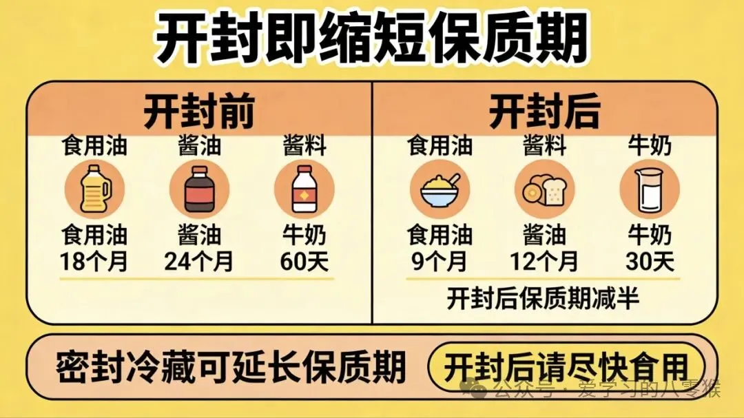 食用油、酱油、酱料、牛奶等,开封后保质期直接减半,务必密封冷藏。