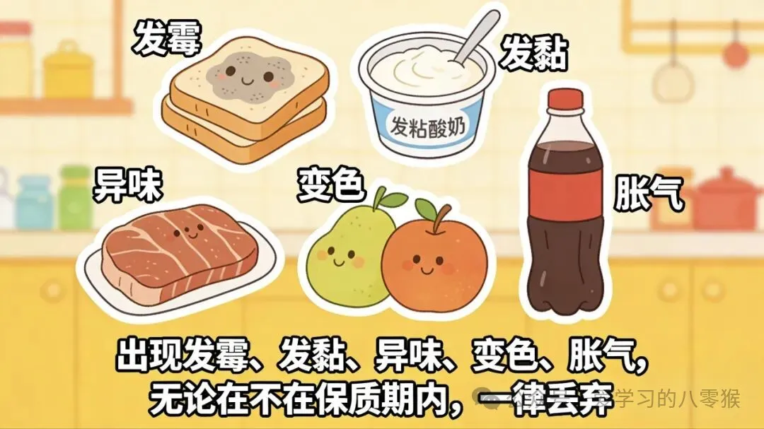 出现发霉、发黏、异味、变色、胀气,无论在不在保质期内,一律丢弃。