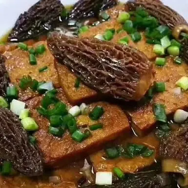 羊肚菌10g、豆腐若干、蒜、盐和酱油适量。羊肚菌泡发洗净;蒜洗净切段;锅中倒入油烧热转小火,加入豆腐,一面煎好翻面,直到两面都煎成金黄色盛出;锅中留少许油,加蒜爆香后把煎好的豆腐、羊肚菌放入,泡菌原汤上清液也倒入,加适量盐和酱油,炖煮至豆腐入味即可。