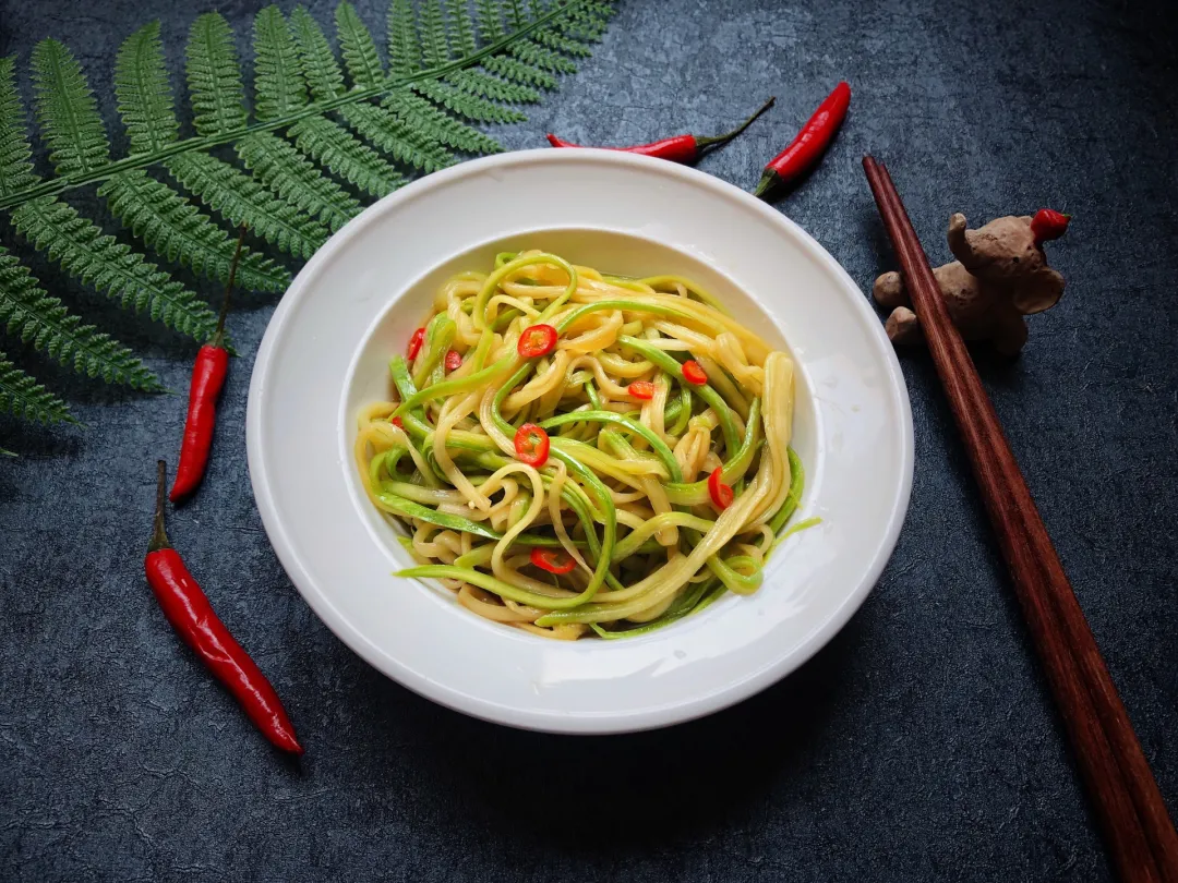 3. 西葫芦丝放在个大碗里,倒入生抽、醋、蔬果粉、盐,把切碎的辣椒放在上面。