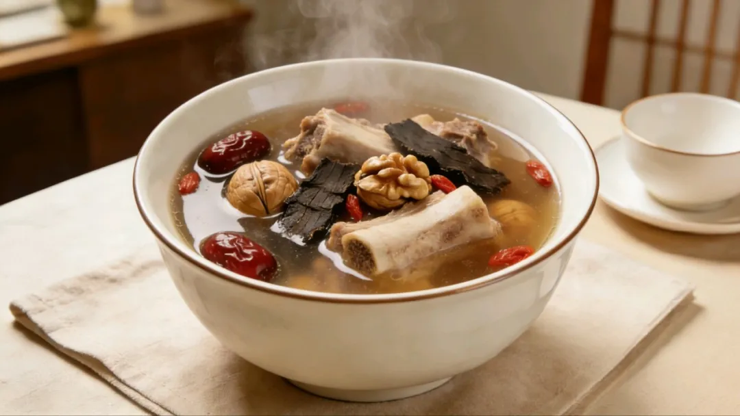 食材:杜仲15-20克,牛骨(或牛尾)500克,核桃仁30克,红枣5颗,枸杞10克,生姜3片,陈皮1小瓣