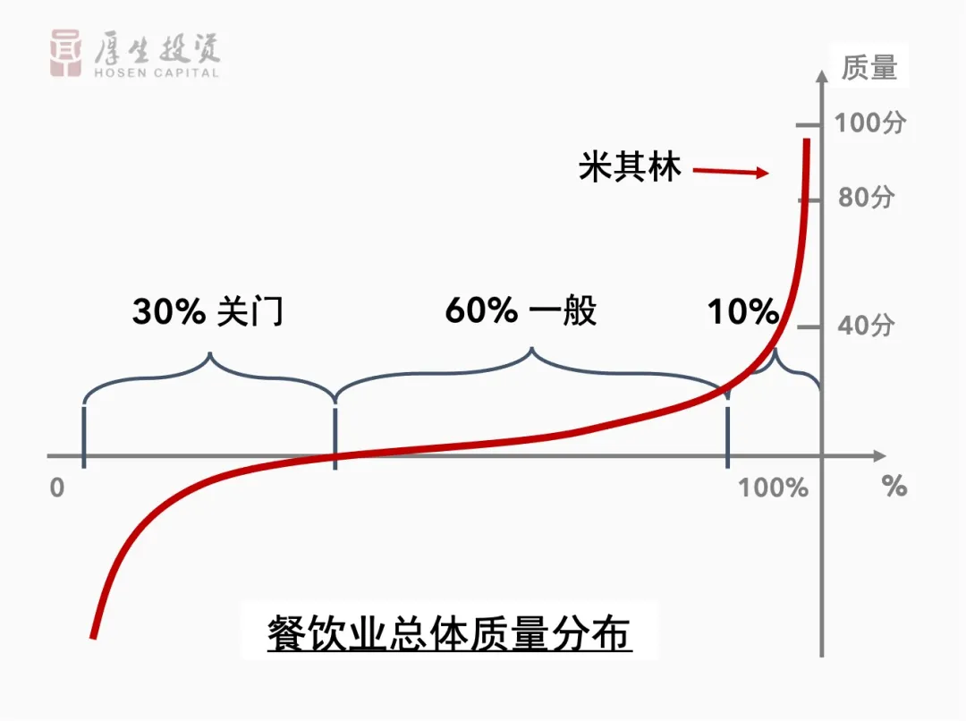 这就导致,餐饮行业的质量分布如图中红线,两端分化严重。一边是追求极致质量的米其林餐厅,一边是每年高达30%的餐饮关⻔,而中间大部分餐饮,其实是不稳定的。