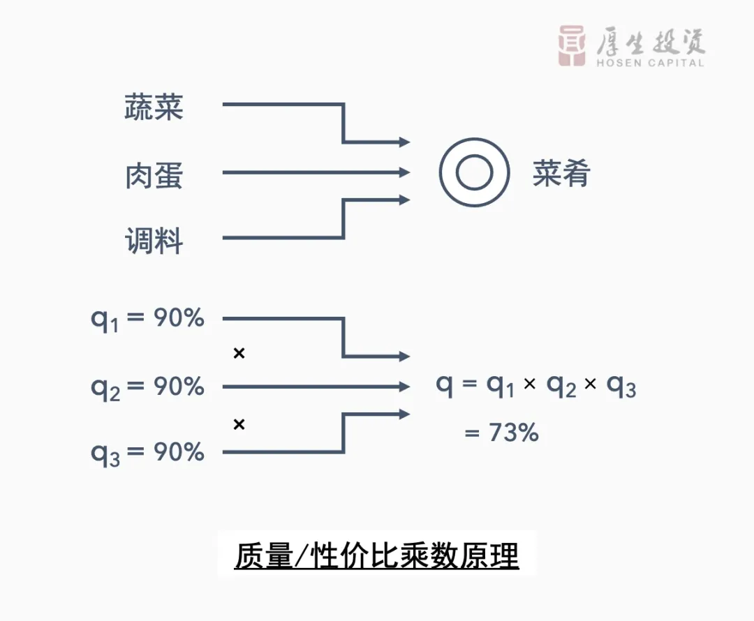 假设菜、肉、调料各自有一个质量值,那么,只要有一个质量低下,乘出来的质量值就很低(如下图所示)。