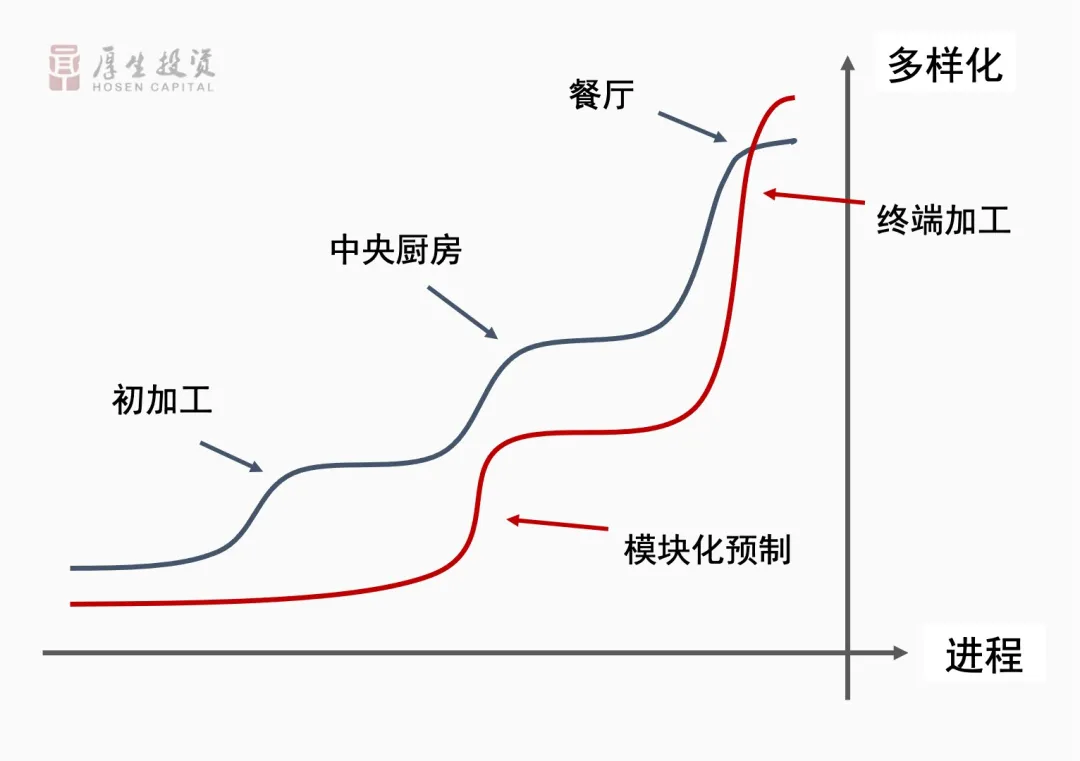 中⻄餐对比,让我们清晰地看到了中餐标准化需要平衡的两个核心目标:终端产品的丰富多样化、工业化流程的高效率。