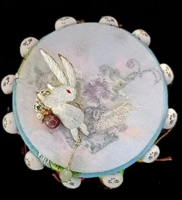 南京市级非遗民间布艺代表性传承人高瑞雷精心创作了一系列与中秋相关的作品。记者看到,其中《玉兔满圆》作品,画面中心是一只栩栩如生的白兔刺绣,侧身而卧,耳朵微微后倾,红宝石般的眼睛闪烁着灵动的光芒。白兔身上装饰着精致的金属链条和珠宝,增添了几分华丽与神秘。背景是一片柔和的渐变色彩,从淡紫色到浅蓝色,仿佛是夜空与黎明的交融。隐约可见的花卉图案在背景中若隐若现,为整个画面增添了一丝浪漫的氛围。环绕在圆形物件边缘的是一圈可爱的白色圆球,每个圆球上都绘有简洁的表情,有的开心,有的惊讶,有的平静,它们像是一群好奇的小精灵,围绕着中心的白兔,共同构成了一幅充满童趣与梦幻的画面。