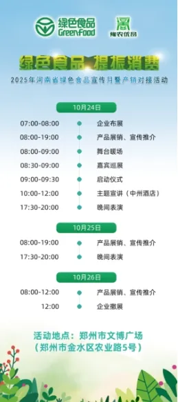 在活动现场,白天,有现场品鉴和直播带货活动;晚间,有才艺表演等着您来参与。豫见绿色“食”光,打卡美好“味”来!10月24至26日,我们在郑州市文博广场恭候您的到来!