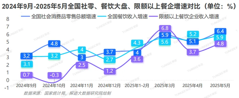 中国食品行业早已是营收连续多年超 9 万亿元的 “巨型赛道”,形成了上游规模化种植养殖、中游智能化加工、下游数字化流通的全产业链体系。从市场表现来看,2025 年 1-5 月全国餐饮收入达 22773 亿元,同比增长 5.0%,但结构性分化明显 —— 限额以上餐饮企业增速连续 8 个月低于社零总额增速,部分时段甚至陷入负增长,行业利润空间持续收窄,降本增效成为全行业的共同诉求。