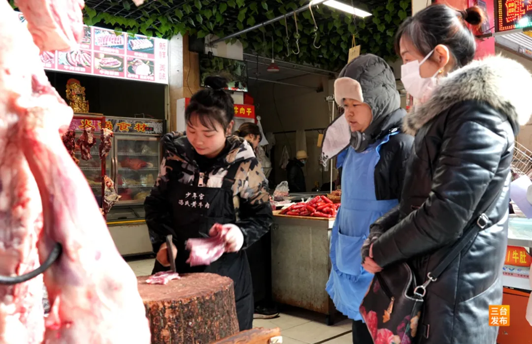 在建设路一家鲜牛羊肉售卖店摊位前,记者看到,不少市民一早便赶来挑选羊肉。摊位上,新鲜的羊肉色泽红润,纹理清晰,整齐悬挂。一旁的案板前,老板正熟练地为顾客称重、切肉。