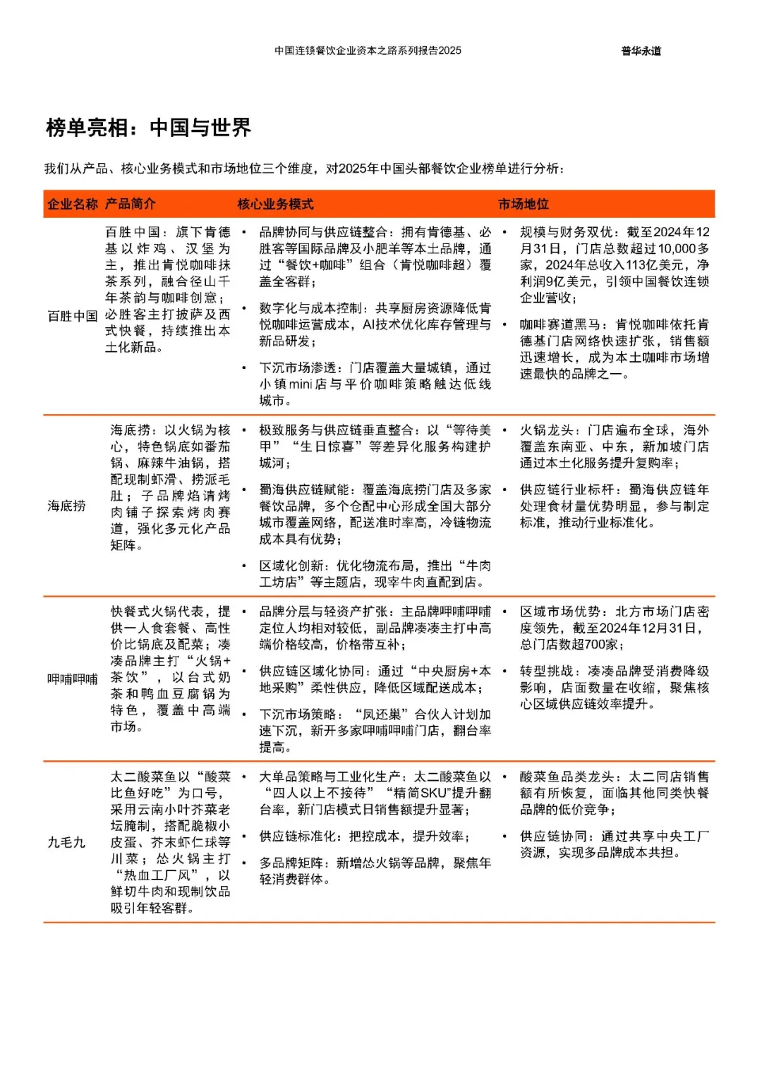 与全球餐饮巨头相比,中国企业在规模体量上仍有差距,但发展势头强劲。麦当劳全球门店超 43000 家,覆盖 100 多个国家和地区,市值超 2200 亿美元;百胜全球门店超 6 万家,旗下多个品牌位列全球餐饮品牌价值榜前列。中国企业中,百胜中国门店超 10000 家,2024 年总收入 113 亿美元,海底捞门店遍布全球 13 个国家,蜜雪冰城等品牌也在加速海外布局。