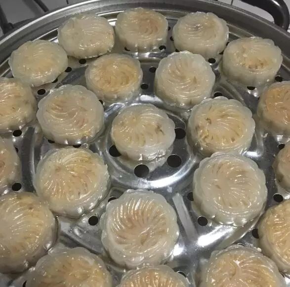 最后一步很简单,主要是将这些制作好了的饼放来蒸煮。开火在蒸锅中放入适量的水,可以开中火,接着就在准备好的蒸架上面抹适量的油,将饼平铺就好了,转大火将它们蒸十分钟,然后再关火,等它凉了一点的时候,就可以把水晶饼拿出来了。其实这种饼趁热吃的时候是最好的,如果等到完全冷了味道就会有所改变。但是也不会过多的变味。