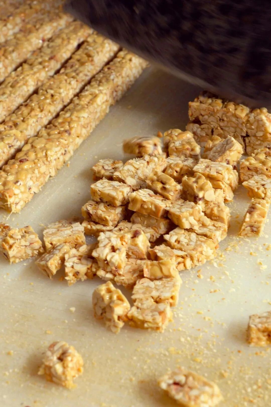 有经验的老师傅用刀斩成一小块一小块的花生糖,简单的一把刀,一柄尺,仿佛是凭着天生的直觉,笔直飞快地横切、竖切,一方方精巧的酥糖一气呵成,这也是老师傅几十年经验的沉淀积累。