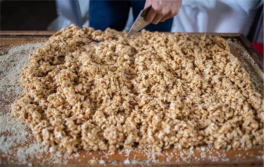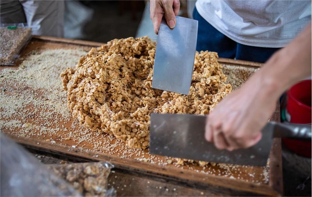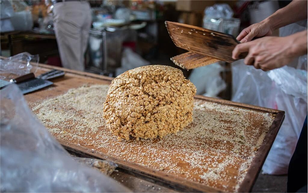 经验老道的老师傅手艺高超,全在于控制花生与糖浆的配比上:糖不够,花生难以凝结,酥糖容易散架;糖太多,成品又不够酥松,口感也发腻。因为不用任何粘合剂和添加剂,做出香而不腻、甜而不齁、酥而不散的花生糖,也只能靠双手的经验掌握食材配比、估算最适当的温度。