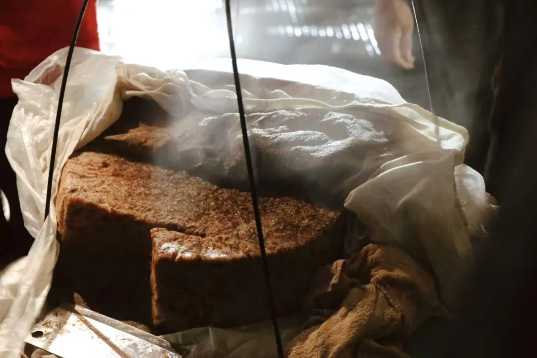 “砰”的一下,把熟粉倒到面板上,立刻就有蒸汽冒出来,香气也飘满了屋子,“糕团”就做好了,接下来开始打糕。虽说现在有了机器,可农村人还是喜欢手工打,经过反复又辛苦的捶打,才能做出糯叽叽的糕团。