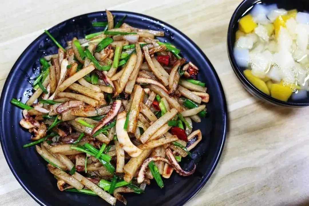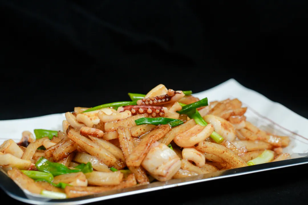 鱿鱼炒糕,是年轻的味道。新鲜鱿鱼切成段状,年糕切成大小适中的块状。锅中热油翻滚,先放入鱿鱼快速翻炒。鱿鱼在高温下迅速蜷曲,接着加入年糕。随着翻炒的持续,年糕逐渐变得金黄,表面微微泛起焦香。