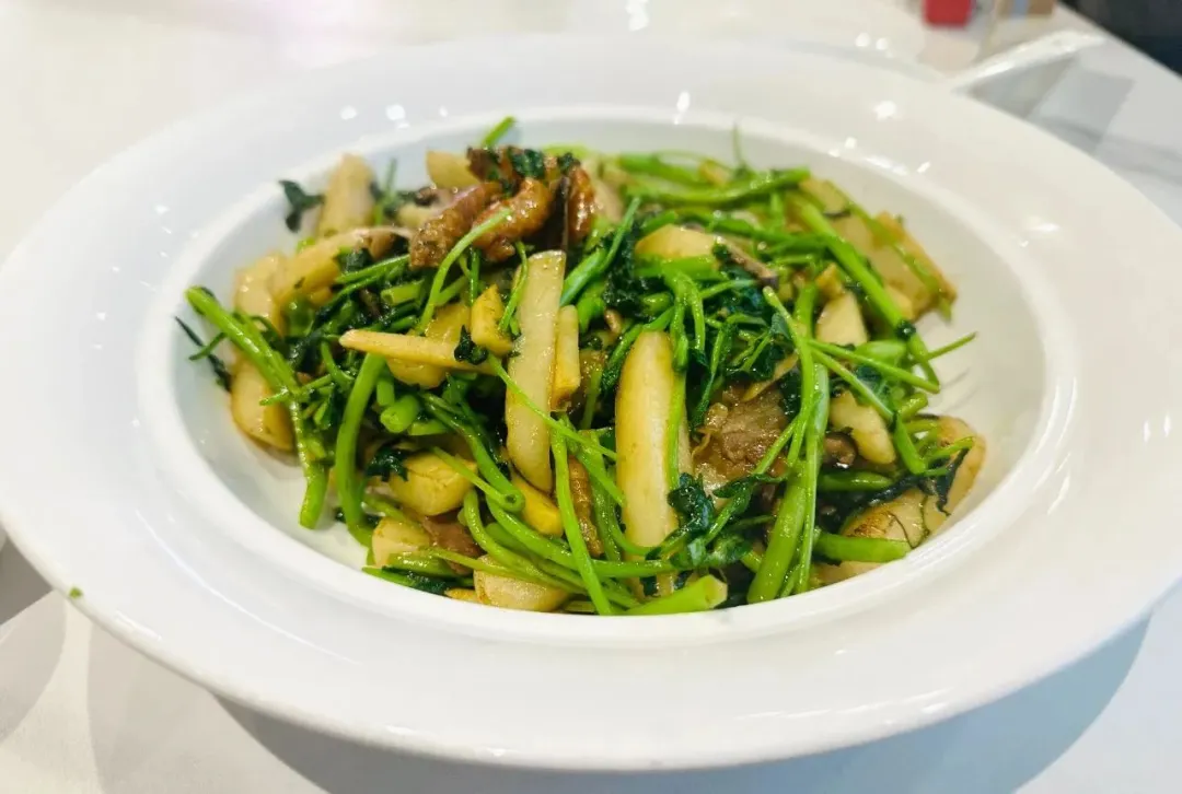 沿着锅边浇上一圈料酒,撒上食盐、放入酱油、糖。猛火快炒中,年糕变软,腊肉和春笋的香味因此渗透入糕中。临出锅前,将花草全部倒入锅中,快速翻炒以免变老,出锅。这一盘,色泽翠绿,口感清新,仿佛把春天吃进了嘴里。