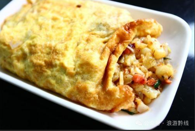 蛋包洋芋是遵义市的特色小吃。在当地,你随便走进一条小吃街,都能看到老板在铁板前熟练地摊蛋皮、炒土豆泥。后来,这股“蛋包风”刮到了贵阳,刮到了全省,甚至成了外地游客来贵州必打卡的美食之一。