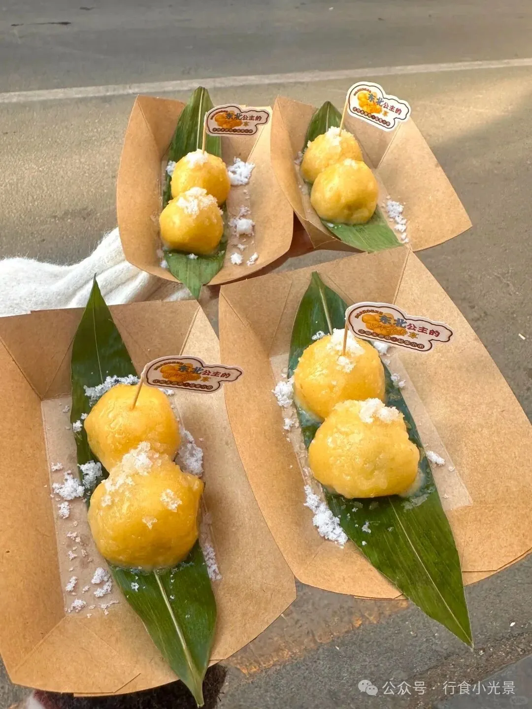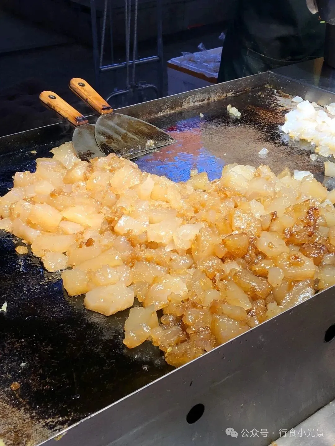 用小铁铲铲着吃,外皮焦脆、内里软糯,多种香味在嘴里交织,黏糊糊的口感超上头。有的小摊加一勺土豆泥,和焖子混在一起更糯叽叽,女生小孩都爱疯了。