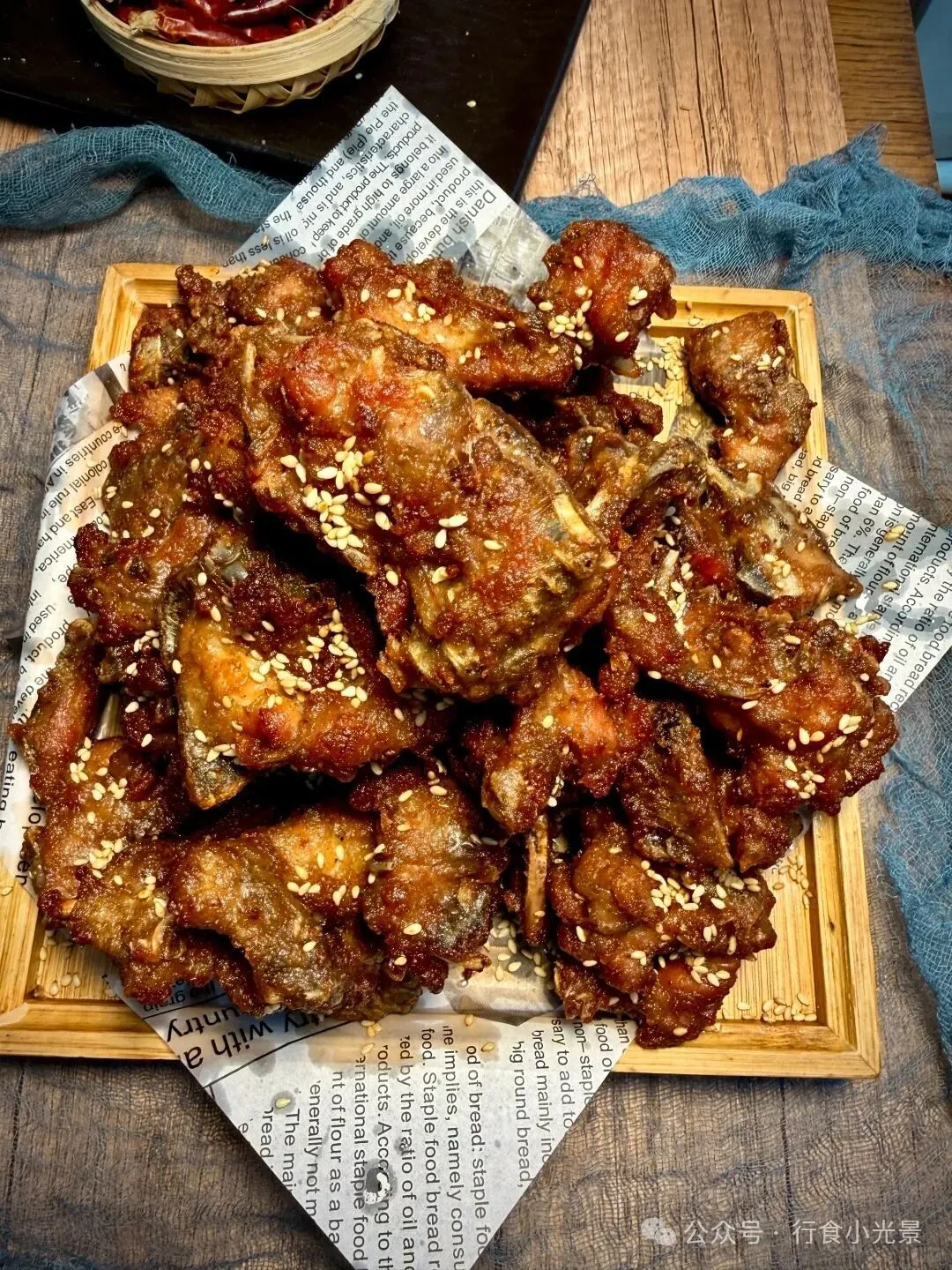 鸡架做法五花八门:烤鸡架是夜市标配,炭火慢烤外皮焦脆,撒上孜然、辣椒面和秘制甜酱,甜辣咸香,越啃越上瘾;拌鸡架是年轻人最爱,撕成条拌上麻酱、辣椒油、蒜末和白糖,酸甜麻辣超过瘾;熏鸡架用红糖茶叶熏制,烟熏味浓郁,肉质紧实,下酒绝了。