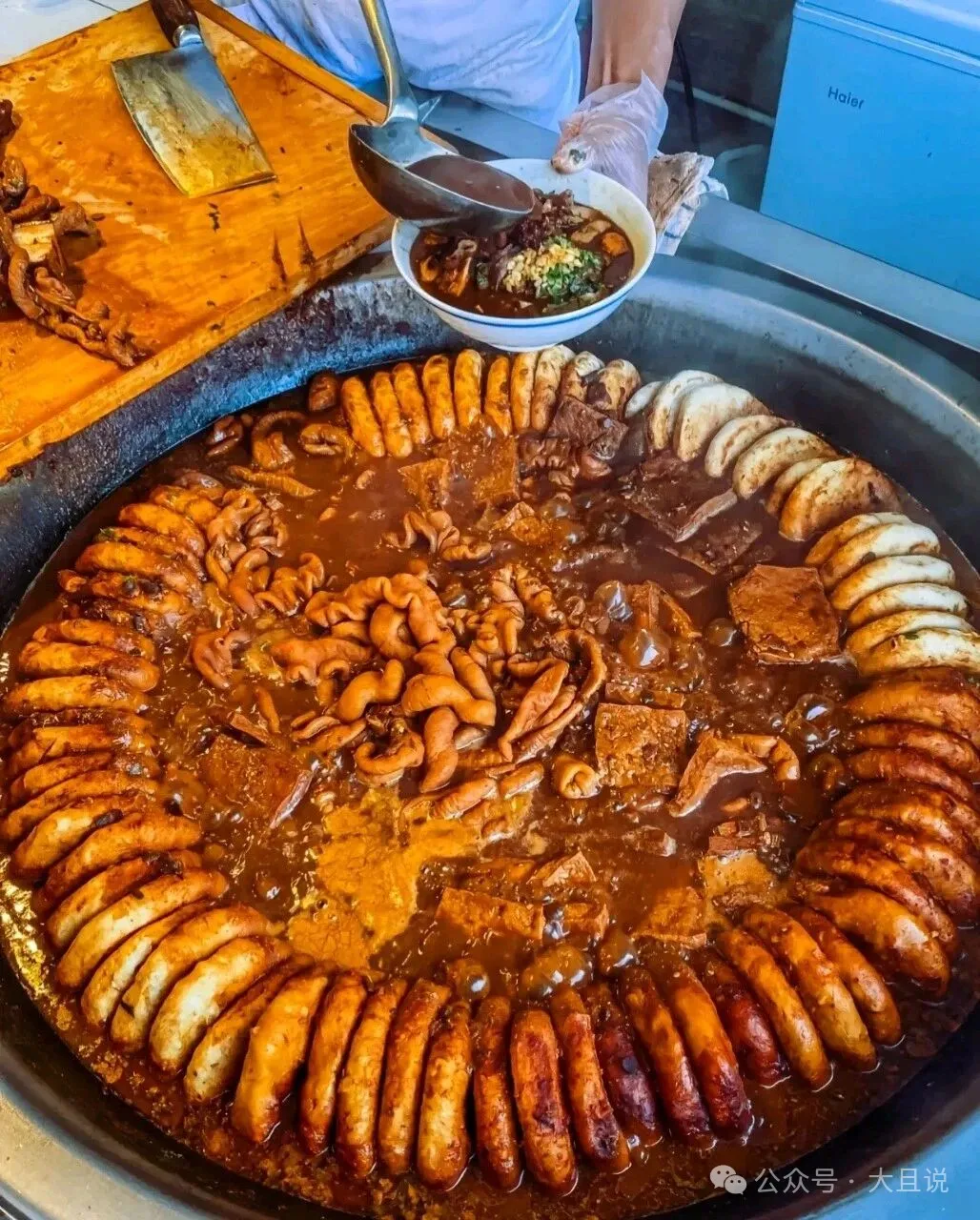 他家的卤煮火烧,以小肠、肝、肺、肚等下水,还有五花肉、油炸豆腐块和火烧为主料,切成片、块放入锅内,随煮随用勺撇去浮沫,再将花椒、豆豉、大料、小茴香、葱、姜、蒜、醋、豆腐乳卤等调料放入锅内同煮。