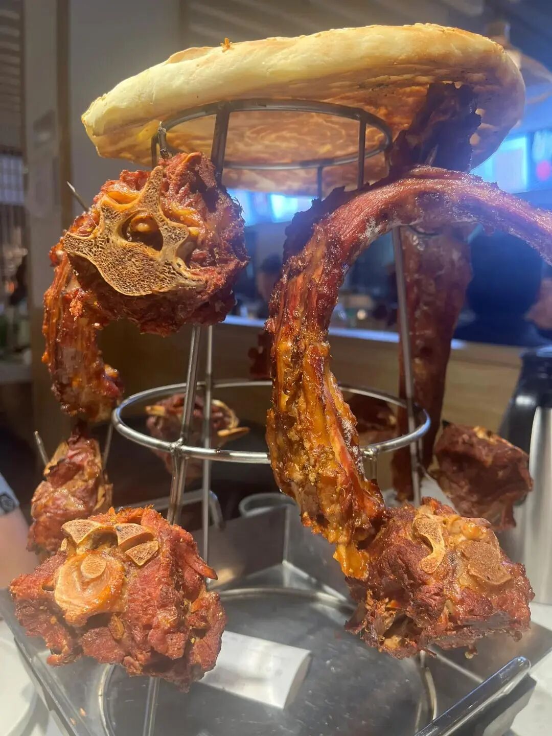 这家的烤羊蝎子绝对是天花板级别,选用内蒙古锡林郭勒的羔羊,外皮烤得焦香酥脆,咬一口“咯吱”响,里面的肉却嫩得流汁,一点膻味都没有。骨髓超饱满,用吸管一吸就全进嘴里,滑溜溜的超满足。