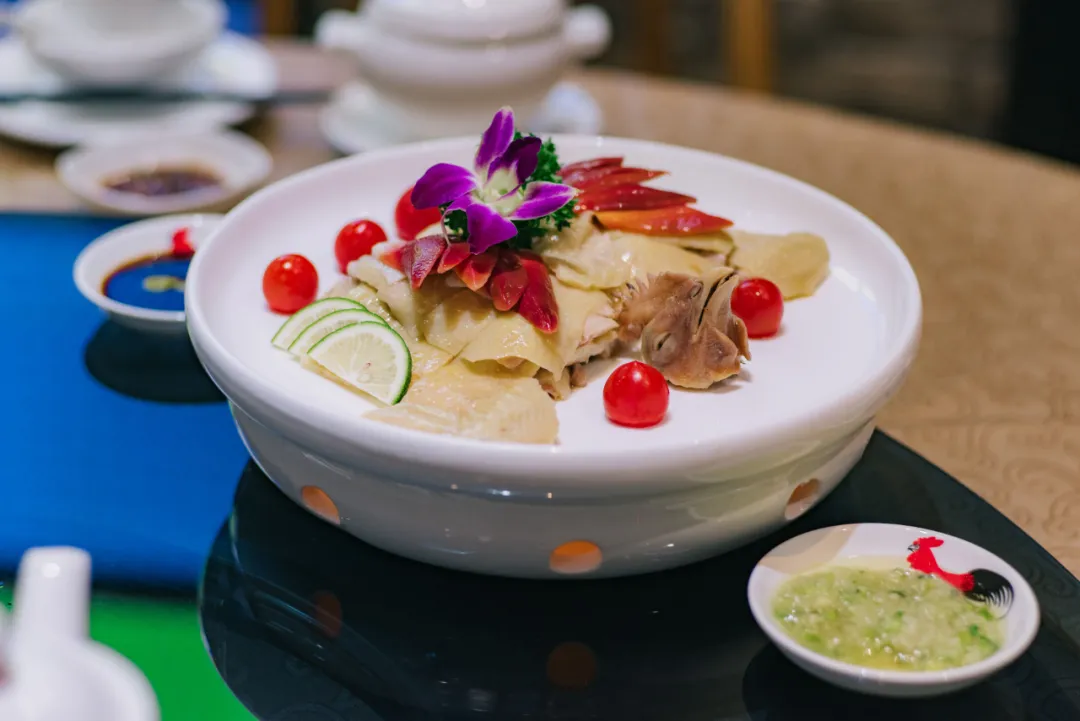 囍缘农庄主打传统岭南菜品,一道新派白切鸡——富贵鸡吸引了不少粤港澳大湾区食客慕名而来。以新鲜土猪猪肚为底,铺上北极贝做装饰,鸡有鸡味,猪肚弹牙,北极贝鲜甜,一口一个,非常过瘾。