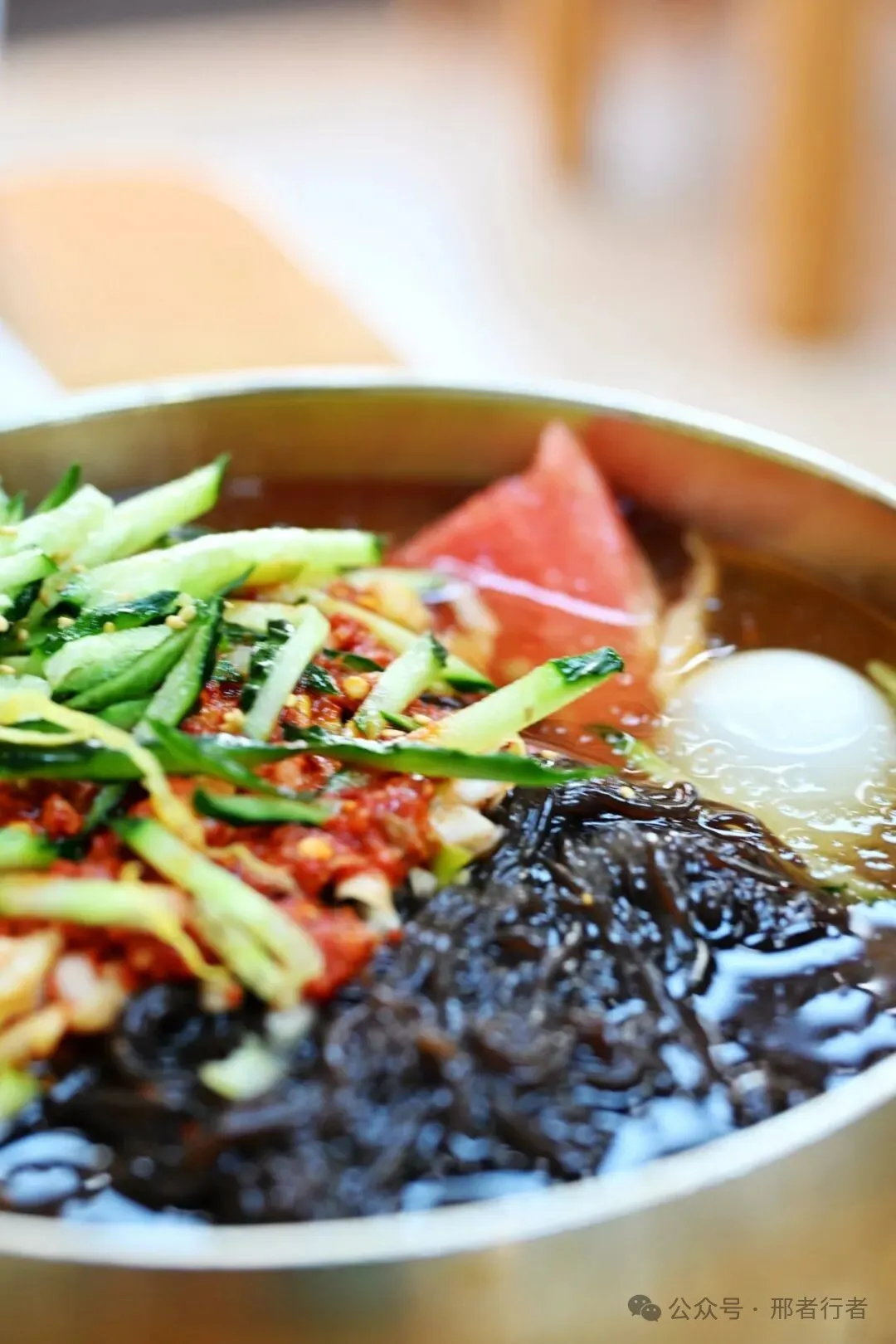 酸甜里带着那么点辣味,桔梗与明太鱼都撕成了条状,先上来的这个冷菜很入味,酱料的丰富口感并没有带走食物原本的味道,唯一的缺点就是量大了点。到延吉的第一顿饭选择了顺姬冷面,还特意到了总店,红红的辣白菜与绿绿的黄瓜丝垫在深棕色的面条之上,白色的鸡蛋漂浮在满满的汤头里,加上一片西瓜点缀,光这色彩就赏心悦目。一口汤下去,淡淡的甜味带着清爽感,正好缓解这午后的暑热,荞麦面筋道又爽滑,虽然牛肉片只是意思意思,但不影响一碗朝鲜冷面整体的水准。