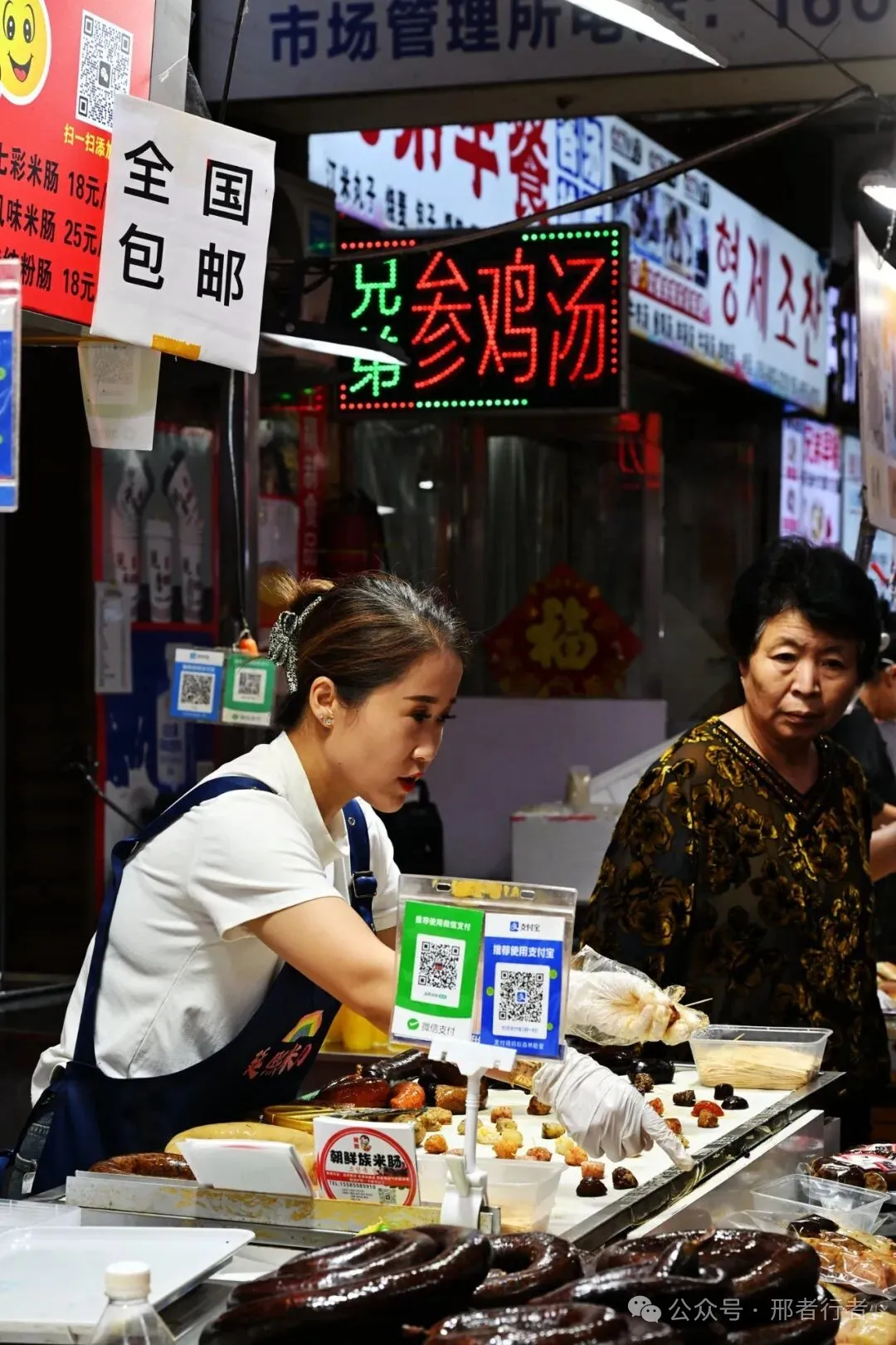 西市场也没有我想象中那样繁华,除了一层几家贩卖鱼干的摊位生意红火,二三层的百货柜台几乎门可罗雀,一些店铺甚至没有开张。几位卖泡菜的大妈也没有我在UP主视频看到的那样活泼与可爱,故事大概都需要演绎。整个市场外观还算现代,但里边的样子总让我觉得走进了九十年代的批发市场,如果没有挂着支付宝与微信收款码的话。我倒是挺喜欢一侧巷子里的几家小店,米肠,米酒和辣白菜,多少勾起了我一点食欲。