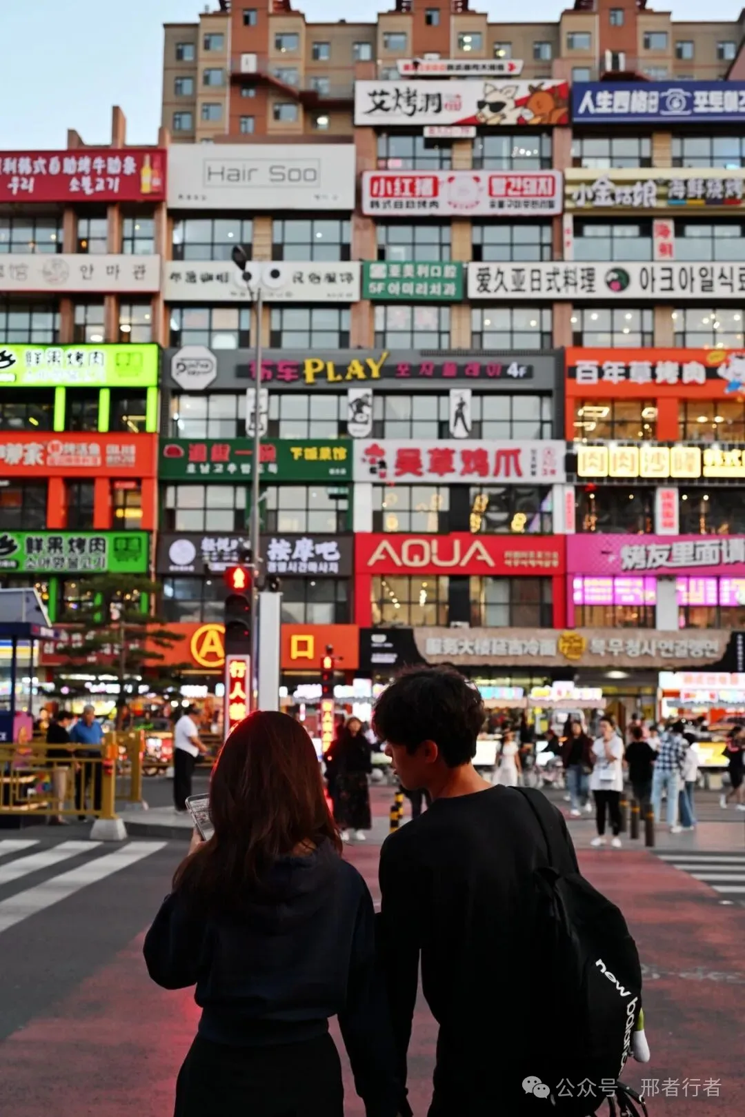 亮灯比预期早了半个小时,这里原本只是大学城的一号楼,五花八门的牌匾与灯箱无意间变成了延吉夜色里的一道风景,经过政府的打造成为了延吉新晋的网红地标。说实话这面墙本身并没有多少亮点吸引我,感兴趣的是这面墙背后的生态,这一块块牌子后面的经营者来自哪里,在这座城市有怎样的故事,无从了解这些,但我知道网红的流量多少带来了些许就业机会,包括我身边给游客拍照的摄影师。女孩手里的那杯咖啡只是个道具,边上男孩手里的咖啡冒着热气,上面都写着延吉。