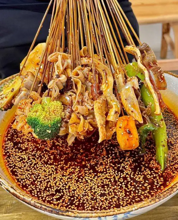 将煮熟的鸡肉、鸡杂以及各式蔬菜,如藕片、土豆、花菜等,穿在竹签上,晾凉后浸入这些汤料中。食材慢慢吸收汤汁的滋味,随取随吃。鸡肉皮脆肉嫩,蔬菜爽口,那浸透的香辣或麻爽,在口中层层释放,是夏日里无比畅快的美味。